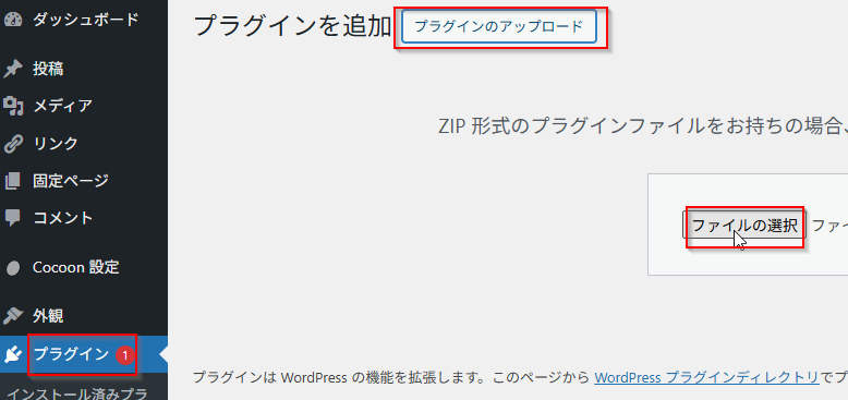 Cocoon-grayishのダウンロードした「grayish-cstmpat-css-main.zip」をWordPress にインストール・有効化します。