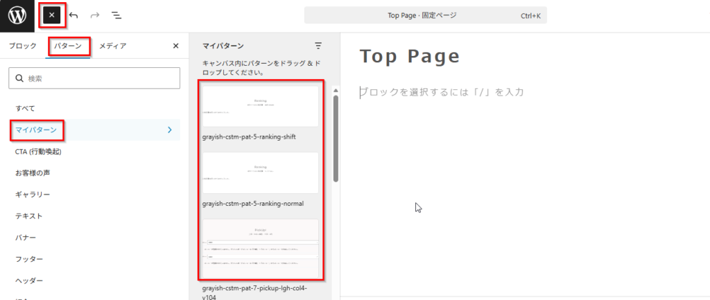 画面のとおりクリックしていくと先ほどインポートしたデータがマイパターンとして表示されますので、これを配置していくことがサイト型構成を作るという事です。