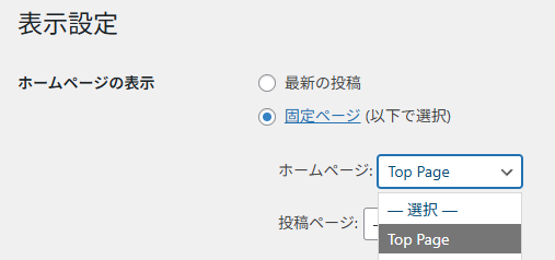 • ホームページ: → 先ほど作成した トップページ用の固定ページ を選択